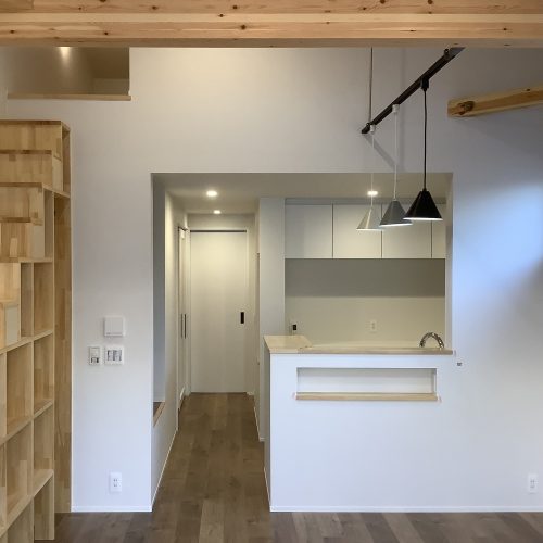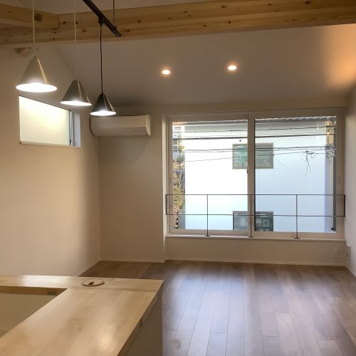 「光」と「繋がり」を考慮した、明るい光に包まれた住まい。 周囲を家に囲まれた立地のため、家族が集まる場を2階に配置。 LDKはロフトに繋がる勾配天井とし、開放的な空間が実現しました。